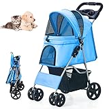 - FUNCIONAL: Las ruedas del carrito perros paseo se pueden usar en todo terreno como césped, grava, pavimento, empedrado y caminos campestres. Las ruedas giran 360 grados, así es fácil de manejar y girar. Para ahorrar espacio en su hogar o coche, se puede plegar. El carro perro tiene dos ventanas de malla (grande y pequeña), así puede ver a su mascota cuando camina. Coloque los artículos esenciales para su mascota como bolsa de heces, correas y botellas de agua en los dos bolsillos grandes.